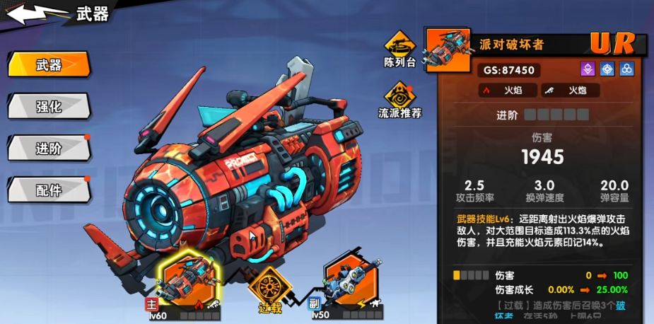 那么如果是给同样带有火焰属性的角色进行武器装备的话,这里大家可以选择的有派对破坏者这个武器,这是作为一个火炮武器使用的,在游戏当中基础的伤害数值虽然只有1900左右,但是后期也可以通过各类主副武器的加成来获取不错的提升能力,在目前的效果当中如果跟火焰属性的角色放在一起用的话,其实在上面也可以找到远距离的优势,使用这个武器的时候不仅可以带来火焰爆弹类型的攻击效果,还可以造成一个大范围的火力输出影响,造成的火焰伤害数值也有113%左右,且后期充能了火焰元素之后,其实还可以增加14%的印记,这样补充到足够的爆发之后,也可以让火焰元素的角色有更多的强化输出。