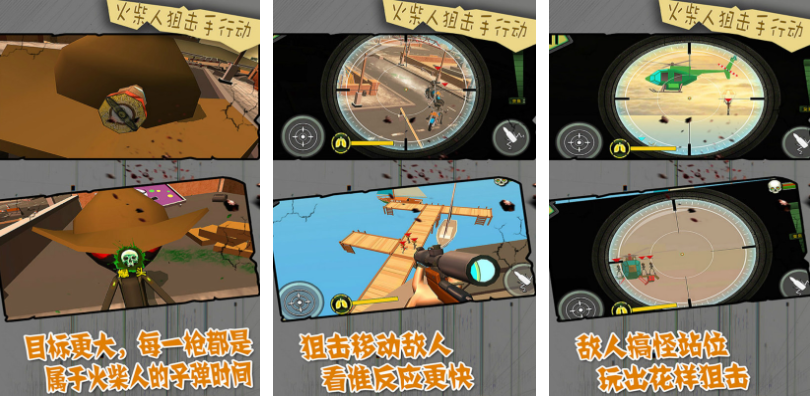 这款狙击手主题的模拟器游戏是火柴人题材的,玩家要聚集的目标都是一些战场中的火柴人士兵,造型生动的火柴人与写实的背景刻画交相呼应,摒弃了新手引导等复杂的设置能让玩家直接开始枪战,任务模式众多且狙击的目标也是与众不同,第一视角完成狙杀任务提供的沉浸感相当不错。