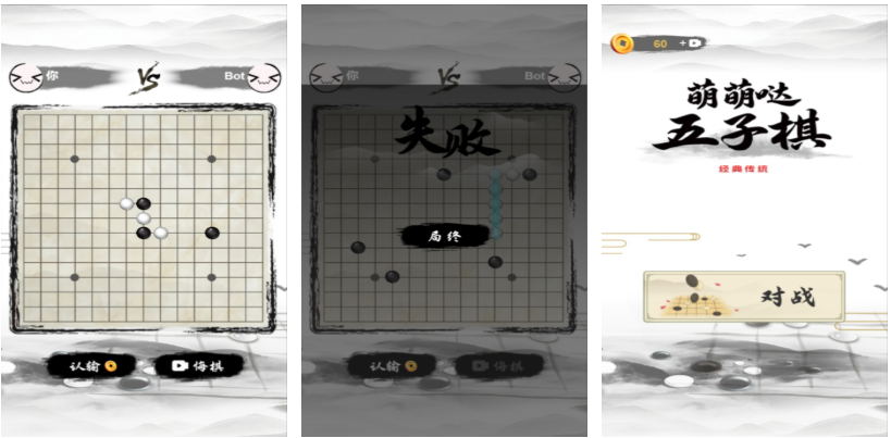 这款有着五子棋对战玩法的双人游戏具备水墨风的场景,相当怀旧的游戏气氛热闹配以五子棋博弈玩法更加有趣,对战机制完善快速可以轻松了解五子棋的规则,让自己的棋子快速连成五个就可以完成挑战,完美复古的音画跟五子棋的玩法足以吸引玩家,超级快速的匹配速度也会让两个玩家快速进入博弈状态。