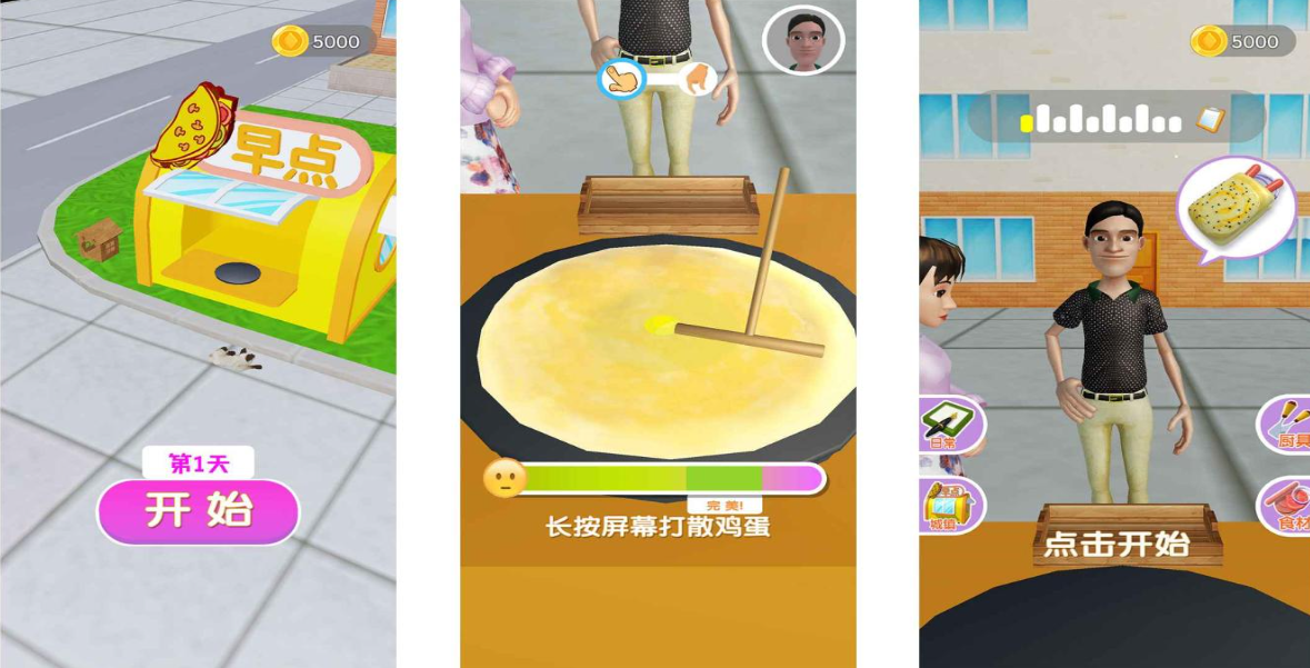主打快节奏单局体验,强调操作效率与流程优化。玩家使用虚拟煎饼铛、刮板、刷子等专业工具完成标准化制作流程,从摊面糊、打蛋、撒料到折叠封装,全程计时反馈。支持早餐组合扩展包,可同步制作豆浆、油条、茶叶蛋等配套品类。三维建模场景具备物理光照效果,面糊遇热鼓泡、酱料拉丝、薄脆碎裂等细节动态真实可信,大幅增强视觉沉浸度。