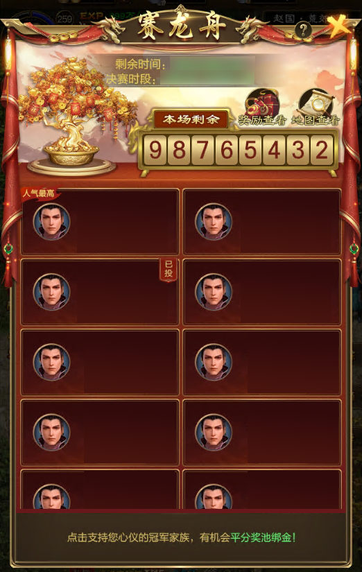 12月19日0:00-12月19日19:30决赛前,可花费绑金支持一个决赛家族,绑金计入全区奖池。等到决赛角逐出冠军后,在赛前就支持了冠军家族的玩家将平分全区奖池绑金!慧眼识珠猜中冠军家族,就能获取海量绑金,赶快为您支持的家族加油助威吧~