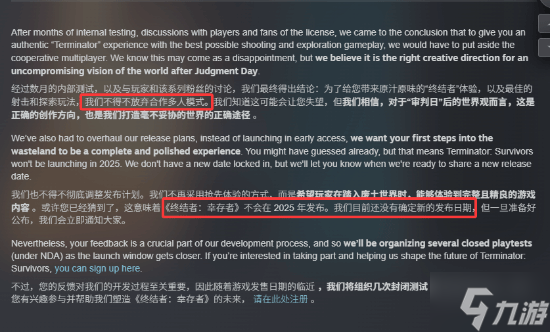 最近的一条《终结者:幸存者》Steam社区官方帖子中,Nacon Studio Milan确认《终结者:幸存者》将会延期:不会在2025年发售,而具体的发售日期目前尚未确定。