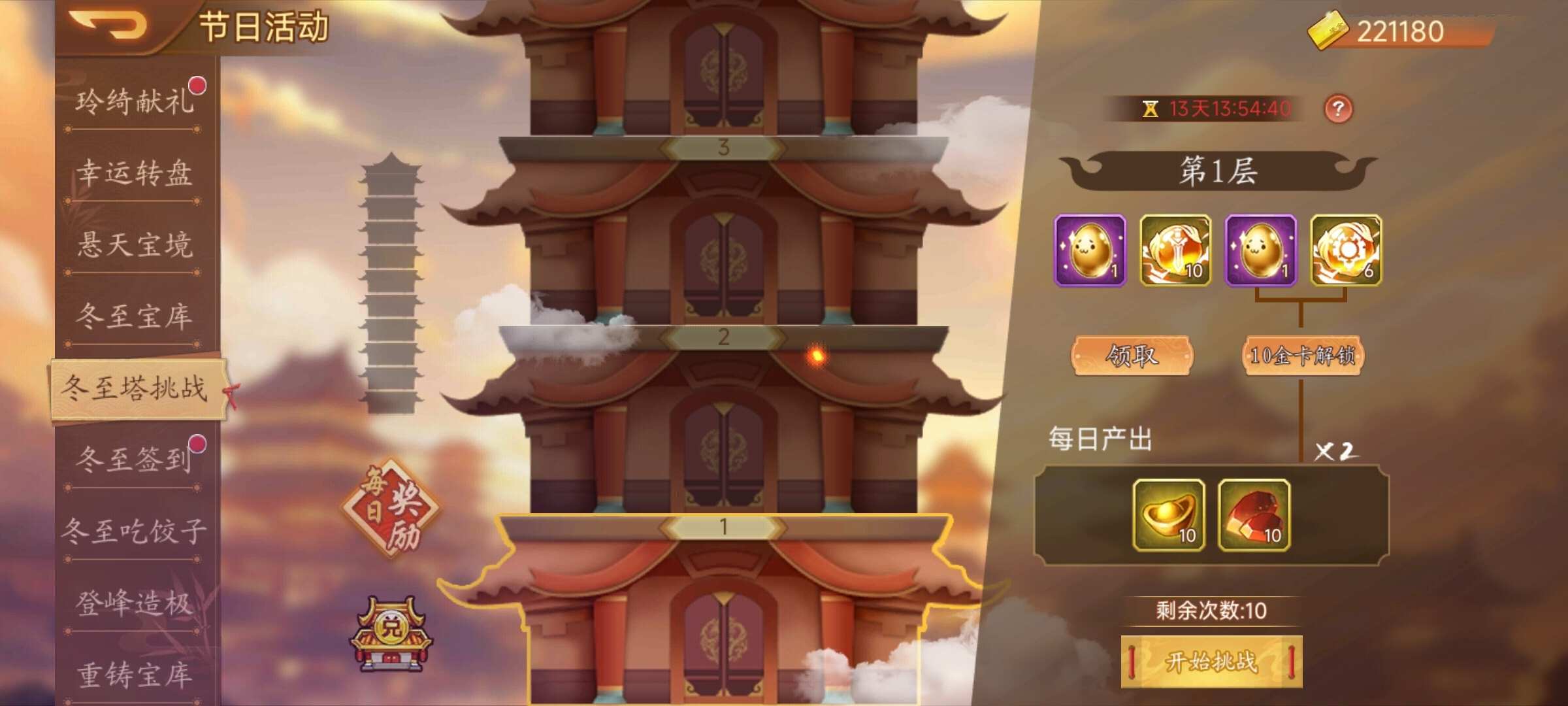 【活动2:冬至塔挑战】起始时间 2025-12-19 10:00:00结束时间 2026-01-01 23:55:00活动内容:活动期间,每天可挑战10次冬至塔(挑战失败不扣除次数),挑战成功即可解锁首通奖励,同时解锁该塔层的每日奖励(通关后次日开始领取),可消耗金卡解锁额外的首通奖励和双倍的每日产出,活动道具【金蛋】可在兑换商店兑换心仪道具。注意:【金蛋】会在活动结束后删除。