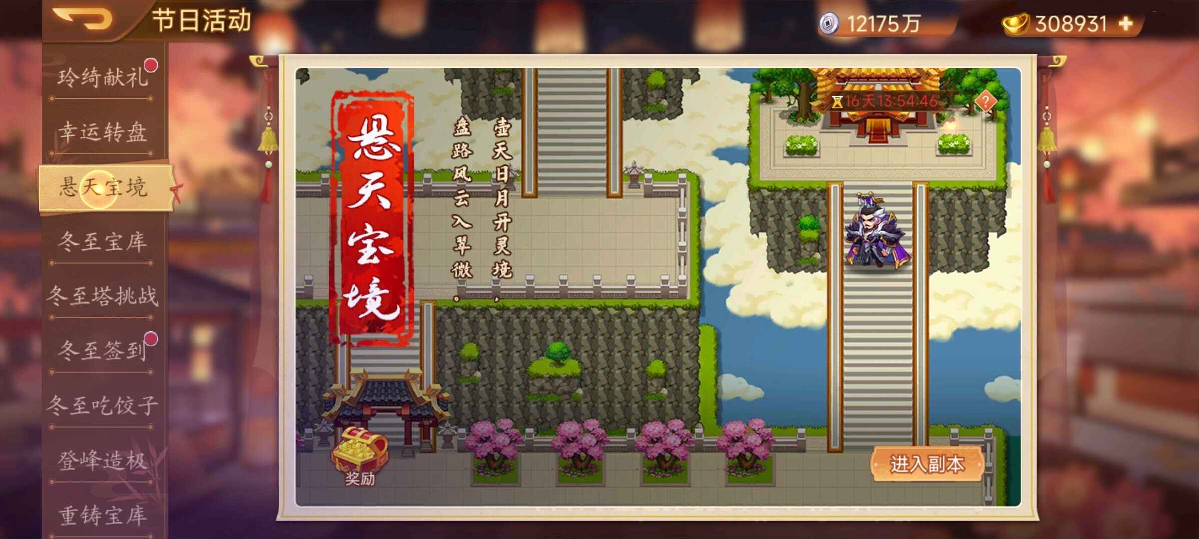 【活动9:悬天宝镜】起始时间 2025-12-19 10:00:00结束时间 2026-01-04 23:55:00活动内容:活动期间开启限时副本探索闯关,闯关成功可开启下一关,完成对应的挑战任务可获得奖励,每个任务只能领取一次。