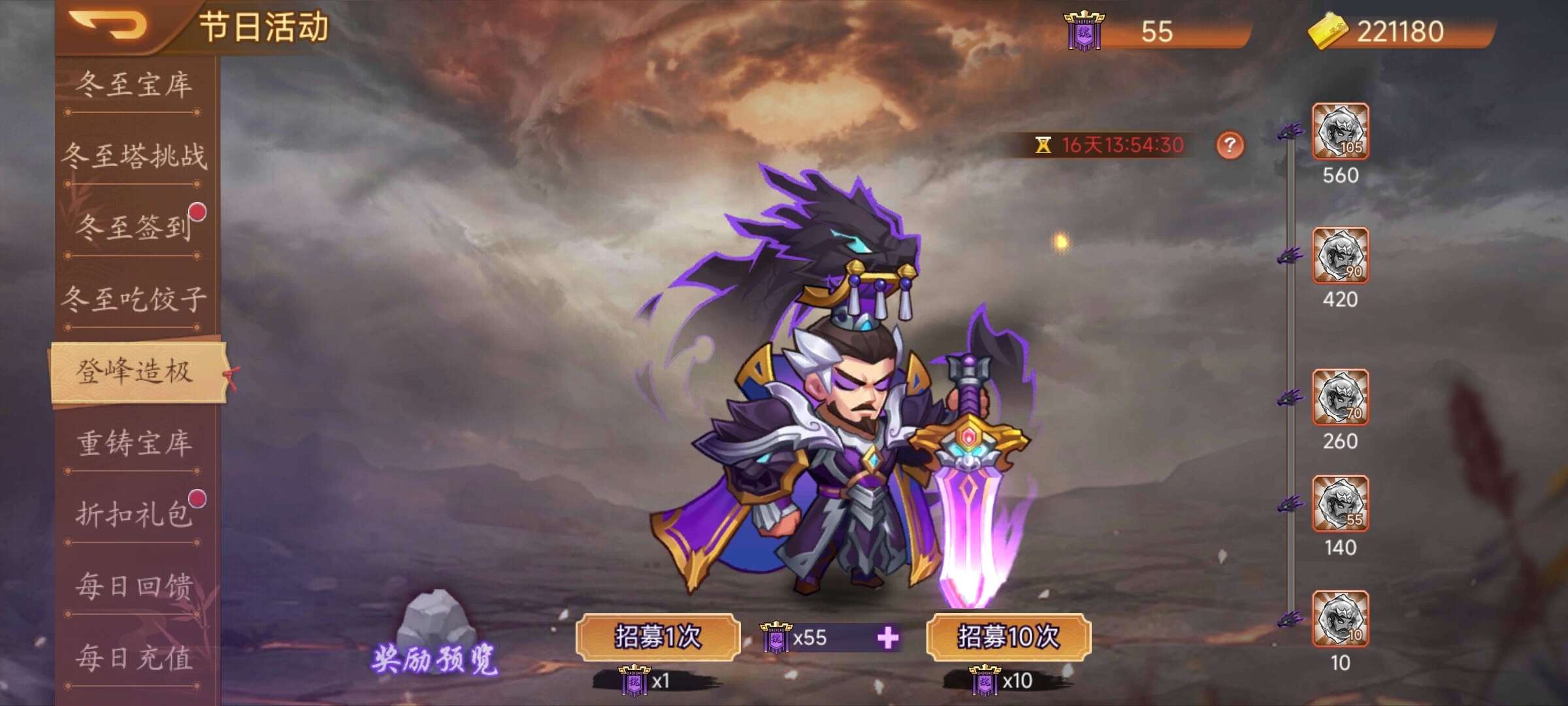 【活动11:登峰造极】起始时间 2025-12-19 10:00:00结束时间 2026-01-04 23:55:00活动内容:活动期间,消耗【魏旗】即可进行招募,招募达到目标次数即可额外获得奖励。