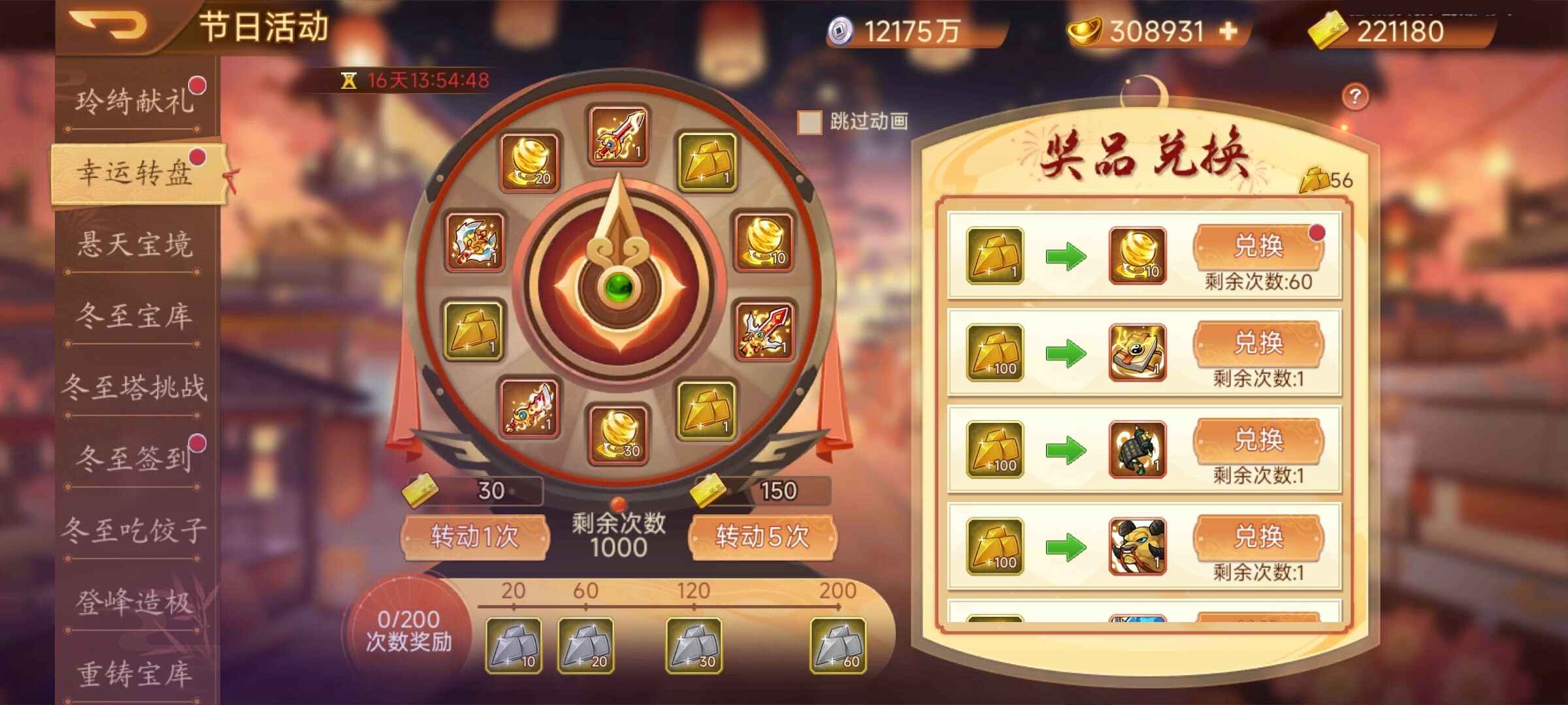 【活动13:幸运转盘】起始时间 2025-12-19 10:00:00结束时间 2026-01-04 23:55:00活动内容:活动期间,消耗金卡转动转盘,极小概率获得玄黄套装武器,大概率获得玄黄之气和龙鳞。玄黄之气用作于玄黄装备强化材料,龙鳞用于兑换玄黄套装部件。
