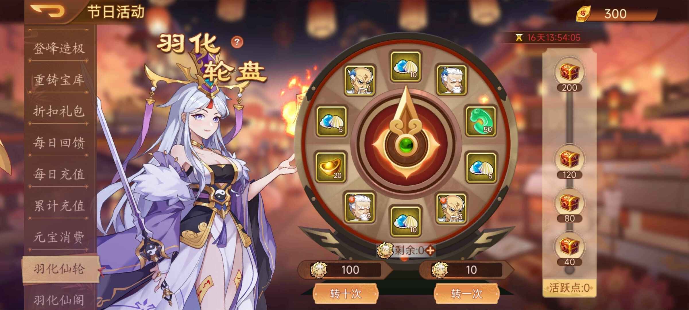 【活动14:羽化仙轮】起始时间 2025-12-19 10:00:00结束时间 2026-01-04 23:55:00活动内容:活动期间使用“六壬式盘”可以转动羽化仙轮,仙轮概率掉落蓝珍珠、于吉仙魂、于吉资石、水镜仙魂、水镜资石等道具。蓝珍珠可于羽化仙阁兑换奖励。累计转动仙轮达成指定次数可以获取额外奖励。
