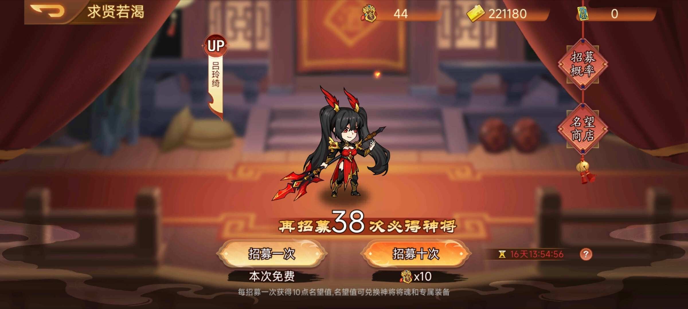 【活动15:求贤若渴】起始时间 2025-12-19 10:00:00结束时间 2026-01-04 23:55:00活动内容:活动期间,可通过消耗招募令进行招募武将,up武将的概率会高于其他同档位武将(每期活动会更换up武将),每次招募可获得10名望,名望可在名望商店兑换道具。注: 活动结束会【名望】清空,活动结束【招募令】不会清空,招募保底次数会延续到下期活动,不会重置。