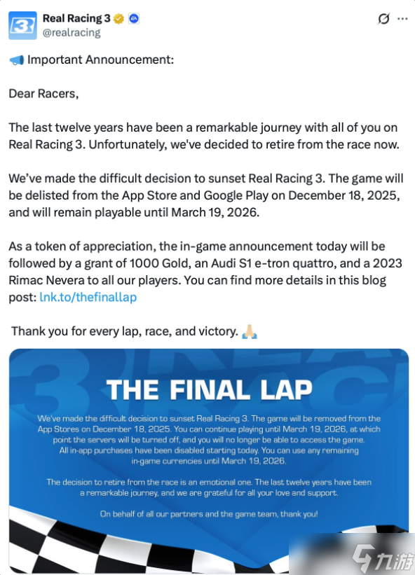 电子艺界公司于今日宣布,其旗下移动平台竞速游戏真实赛车3将于2026年3月19日正式终止运营。自即日起,该游戏已全面从各大九游下架,尚未下载的用户将无法获取,而已安装游戏的玩家仍可在服务结束前继续体验。