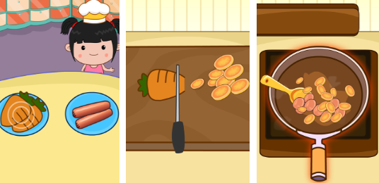 聚焦家常菜教学,内置真人语音分步引导,如“先打两个鸡蛋”“青椒切丝后下锅”。界面采用柔和配色与圆角图标,操作动线严格对应现实流程:备料→热锅→下料→翻炒→盛盘。语音提示降低理解门槛,完成整套流程后即时呈现成果动画,帮助孩子建立“我能独立完成”的积极自我认知。