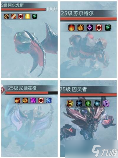 目前游戏中的世界首领一共有12只,其中25级的首领4只,它们都位于出生州地区,分别是阿尔戈斯、苏尔特尔、尼德霍德、囚灵者。