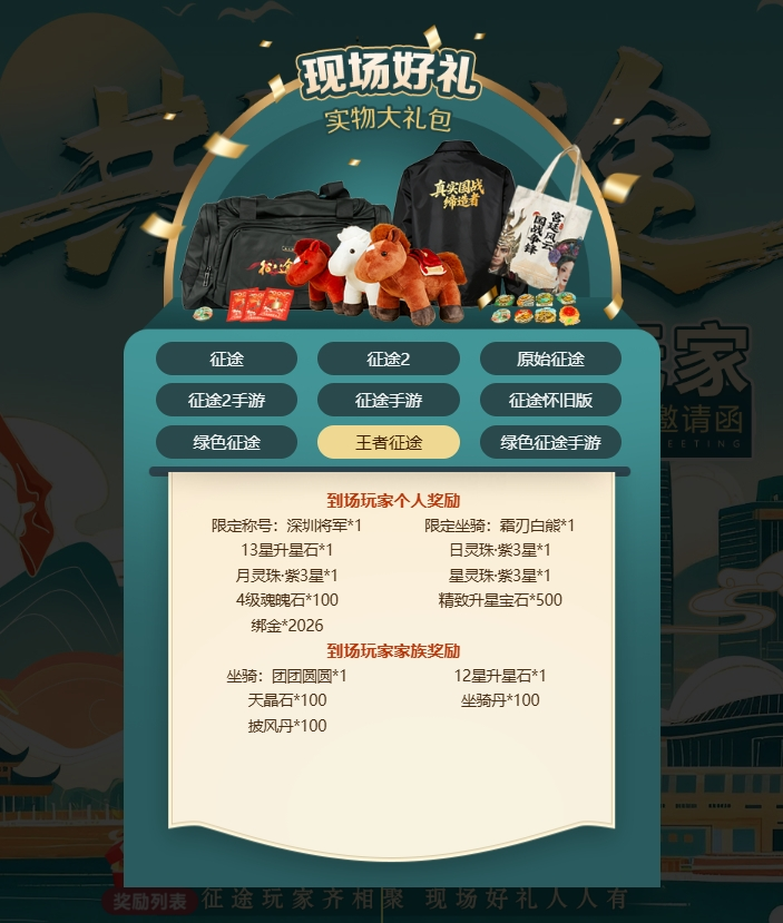 1、精美实物奖励:现场领取征途定制夹克、定制旅行包等周边好礼,精彩记忆带回家!