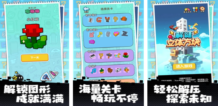 常规的解谜都只是平面或者是在场景里寻找物品,如果想要锻炼更丰富的思维,那就可以尝试立体方块解谜,在里面会设定大量的立体图案,玩家需要在立体的场景中,去掉多余的方块,这样才能获得目标图案,挑战过程中会有大量的关卡,会跟随挑战,循序渐进的提升难度,在这些立体方块上会有大量的数字线索,玩家需要根据线索不断动脑,这样才能获取特定的立体图案。