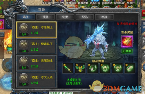 1、首领,刚开始只有“霸主”BOSS,后续根据玩家的仙职和游戏进度会解锁其他类型的boss。不同类型的boss爆出的装备不同,玩家根据自己的需求和等级去打对应的boss就行。