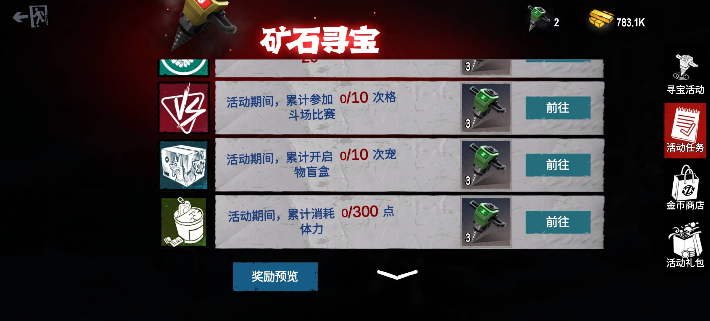 完成节日活动任务,可获得一定量寻宝钻头,包括累计登录、花费金币、送好友币、格斗次数、消耗体力和开启盲盒任务等。