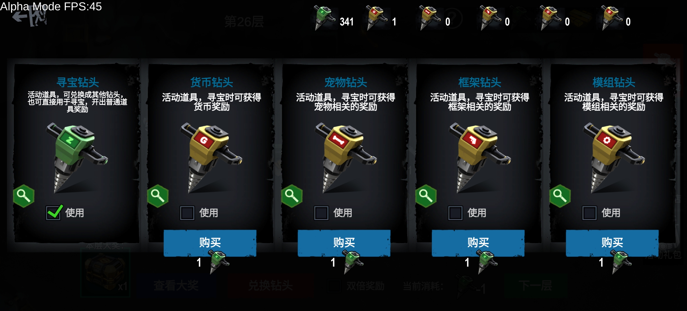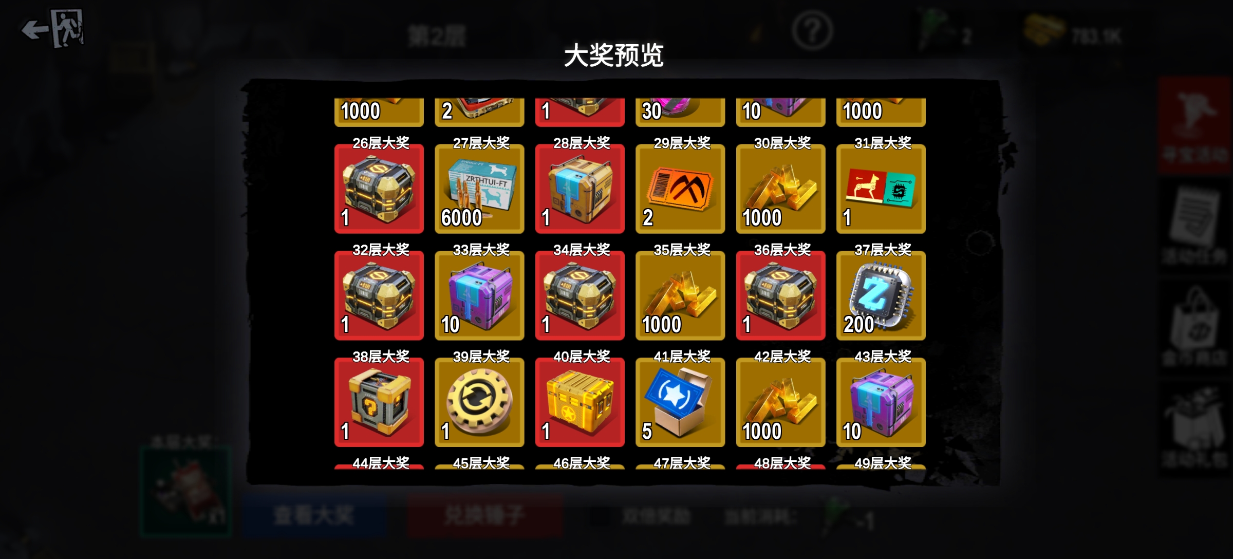 本期同样有双倍奖励玩法,消耗3个钻头可获得双倍奖励。此功能建议在较高价值的大奖层使用,比如在第28层,勾选双倍后消耗3个钻头砸中大奖可获得2个高级模块自选宝箱。大奖解锁后的其余本层免费奖励不消耗锤子也不会获得双倍奖励。