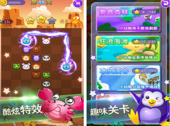 以经典的连连看,连线各种可爱小动物为主,仿佛进入了充满着奇幻的农场世界一样,有3d的动画效果,还有着hd水晶画质。通过仔细观察每一个关卡显示的各种动物头像,将两个一样的进行连线,就可以完成消除。有上千个关卡以及6种不同的模式,大家都可以自由的选择,要有很好的操作能力,才有机会得到很高的分数,顺利通关,看到炫酷特效。