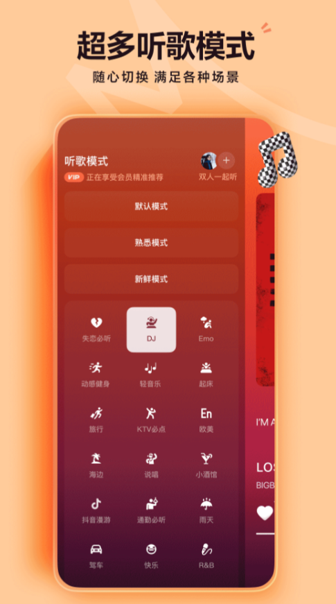应用内超过三千多万首音乐免费直接听,没有套路没有广告,点什么就能听什么,不需要看广告或者VIP和累积时长,平台还有自己研制的播放模式还有音效效果,即便是在不带耳机的情况下也能感受到立体环绕音乐,无损的音乐配备上超清的MV体验特别好。