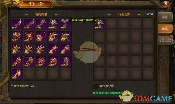 6、所有行会成员可将的装备(指定等级以上)放入行会仓库,同样可获得一定的行会贡献