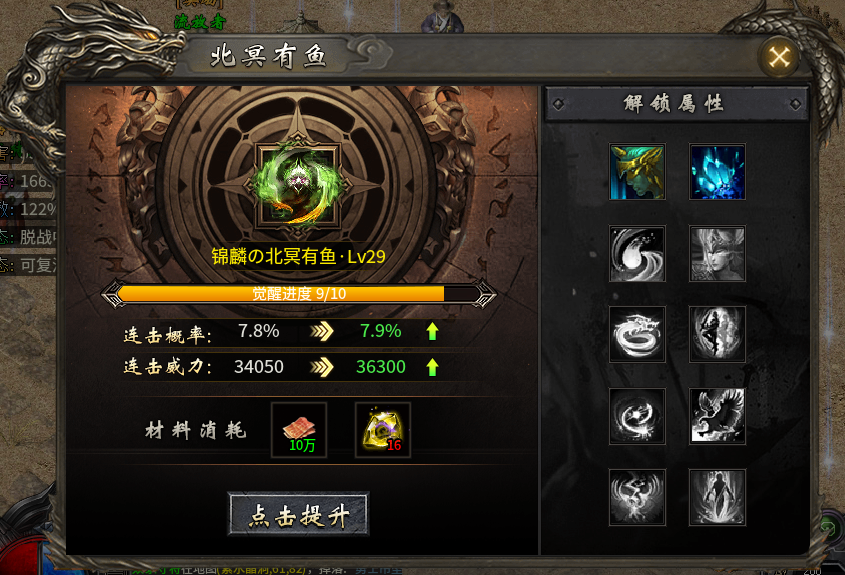 在第二大陆遗忘之地-北冥有鱼NPC处,可提升北冥有鱼,获得大量攻击、生命、切割、连击等属性提升。