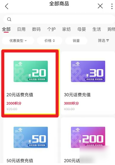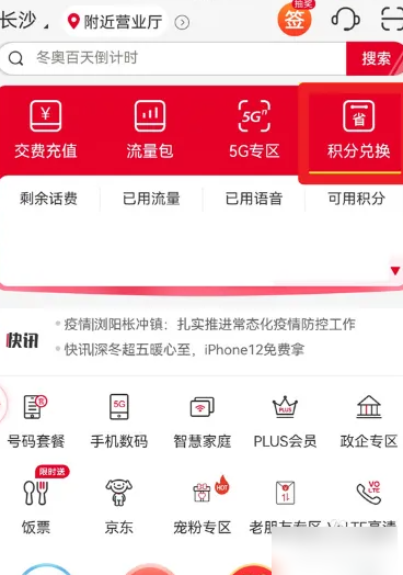 在积分商城点击【搜索框】,搜索【话费兑换】后,选择话费充值金额进行兑换即可。