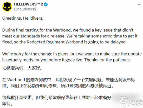 箭头游戏工作室发布声明称:“各位绝地潜兵,大家好。我们在对这款战争债券进行最终测试时,发现了一个关键问题。该问题没有达到我们的上线标准,我们需要额外时间进行修复。因此,《绝密军团》战争债券将推迟上线。对于此次计划变动,我们深表歉意。我们希望确保更新内容完全准备妥当后,再和大家见面。感谢各位的耐心等待。” 不出意料,社交媒体上玩家们的评论也是褒贬不一。