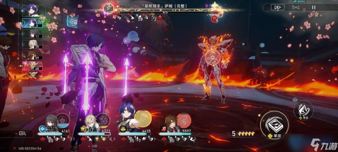 弱点破韧瘫:看准当前弱点属性(比如闪雷),集中火力轰开它的韧性盾!破盾瞬间,场面逆转:萨姆硬直 2 回合+ 全场回 5 能量 + 清 DEBUFF+50% 易伤挂身!这是你的绝对输出窗口,砸大招别犹豫!