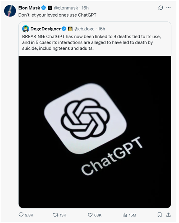 本轮“口水战”似乎由马斯克率先挑起:当地时间周二,有帖子称自 2022 年上线以来,ChatGPT已被关联9起与其使用相关的死亡事件,其中5起据称是因与ChatGPT的互动导致自杀,包括青少年和成年人。马斯克随即转发并评论称 “不要让你的亲人使用ChatGPT”。