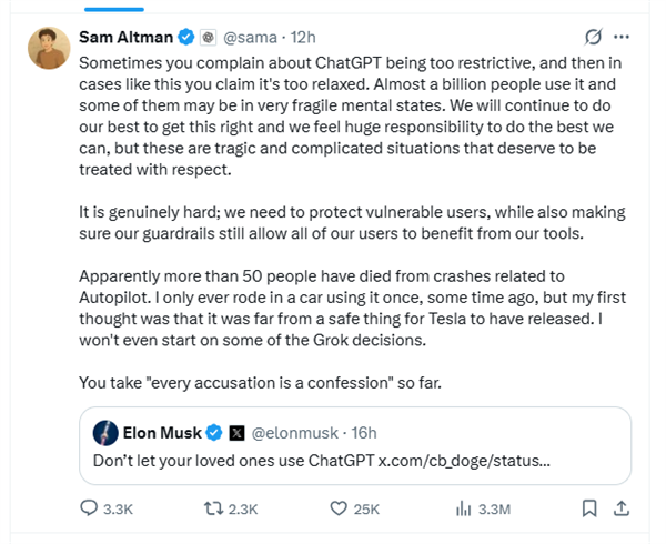 奥尔特曼立刻予以反击,他先是为ChatGPT 进行了辩护,并强调了OpenAI保护用户的意愿,随后将矛头直指特斯拉的自动驾驶技术,称其存在安全隐患。
