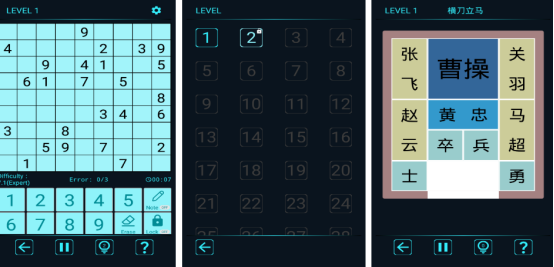 众多智力难题等待你前来破解,比如数独,要根据当前的数字提示填满空格数字,还有完整的三国华容道,通过左右滑动屏幕,将曹操字样快速挪动出口,当前包含40个不同级别华容道设计,玩家要投入你的智慧来突破重重关卡,在规定的步数之内完成闯关。