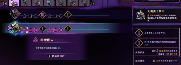 喜欢主动攻击的朋友可以关注无畏勇士刻印。防御状态下按一下攻击就可以发动无畏冲锋,在重击敌人的同时,还可以根据移动的距离去附加额外的伤害。一急时冲锋过程就能灵活地改变方向,针对三米范围内的目标都可以造成25%的伤害提升。同时还会拥有狩猎巨人的效果,针对首领级的怪物就会有额外6%的增伤。喝下炼金灵药之后,还能获得灵药回复量大概4%的临时护盾,可以有效提升续航的能力。搭配投掷强化的效果,投掷攻击伤害就可以增加6.0%。