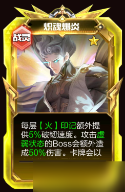 -每层【火】印记额外提供5%的破韧速度。攻击虚弱状态的Boss会额外造成50%伤害。卡片会以自身为中心周期性释放火焰冲击,造成伤害并获得一层【火】印记。