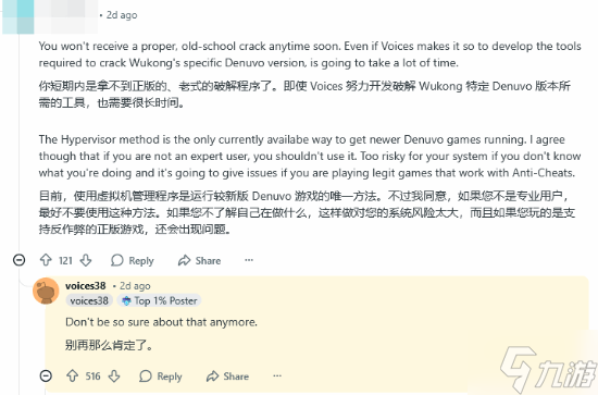 对此,voices38给出了反对的意见:“现在可别再这么确定了。”暗示自己已经掌握了全新的方法,可能在不久之后就能够成功破解《黑神话:悟空》的D加密保护。