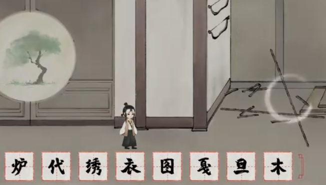 6、拆分【袋】,把【衣】放到镜子前面,获得【绣】,拆分【绣】和【灯】,拆分【秀】,组合【禾】和【火】得到【秋】,等门上图案变成秋天后,把【秋】拖到门上。