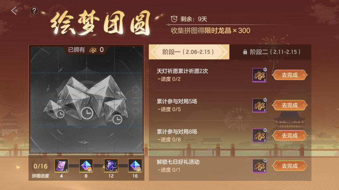 完成任务获取碎片,即可点亮拼图,根据收集进度领取相应奖励,限时龙晶*300、皮肤碎片、寻宝签等多种奖励等你来拿。