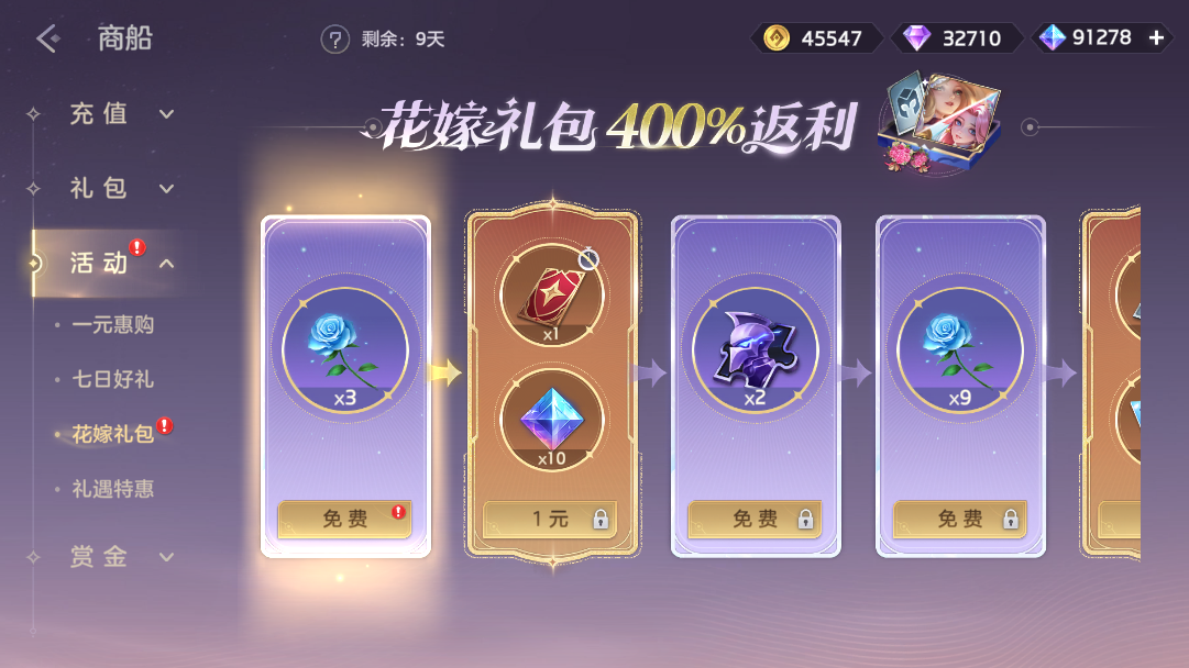 按顺序逐步解锁礼包,倾心之约皮肤自选箱、倾心之约头像自选箱、礼券、排位守护卡、热诚之馨、淡雅之馨、浓意之馨等多种奖励,累计可享400% 返利。