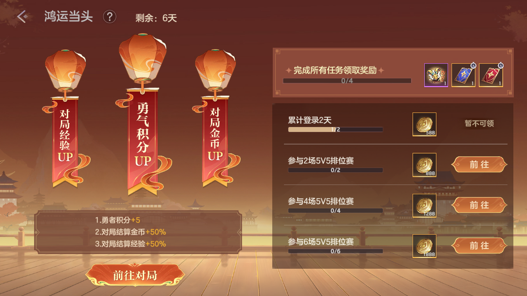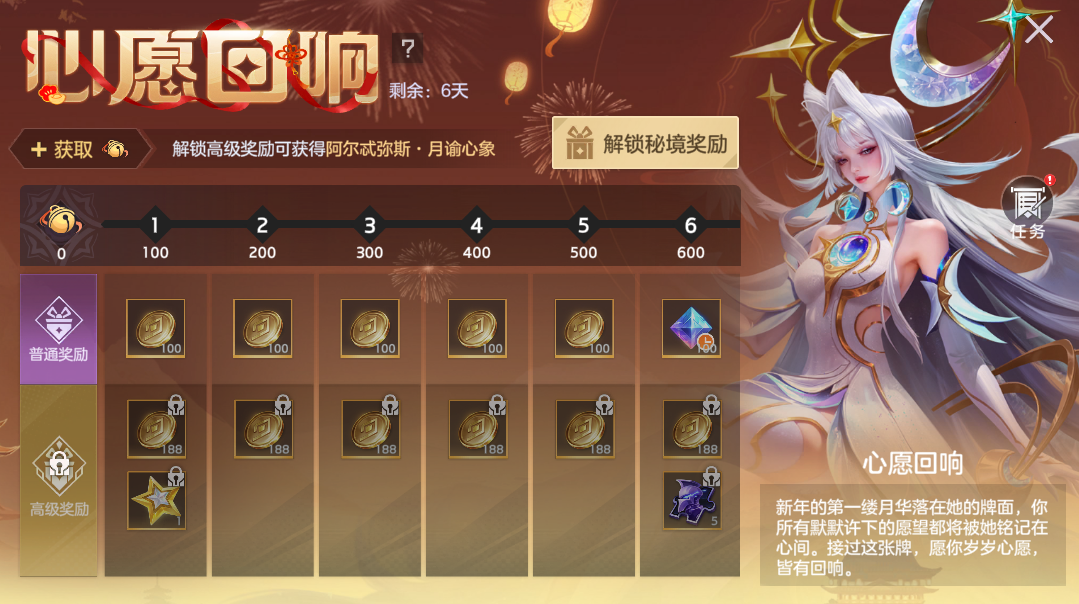 完成对局任务,提升等级免费获取新年福卡、金币,付费6元解锁金星可以获得龙晶*120、龙魂祈福卡、皮肤碎片。