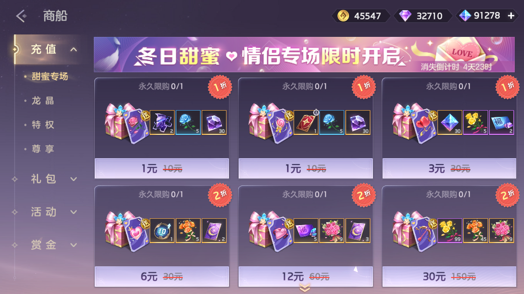 甜蜜礼包限时直售,甜蜜卡片、龙晶、10级绘卷经验包、热诚之馨、浓意之馨、淡雅之馨、温情之馨等道具你来拿!收集甜蜜卡片可在收集好礼活动领取奖励。