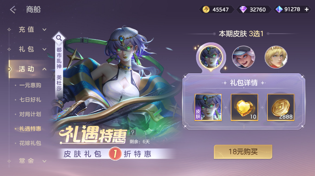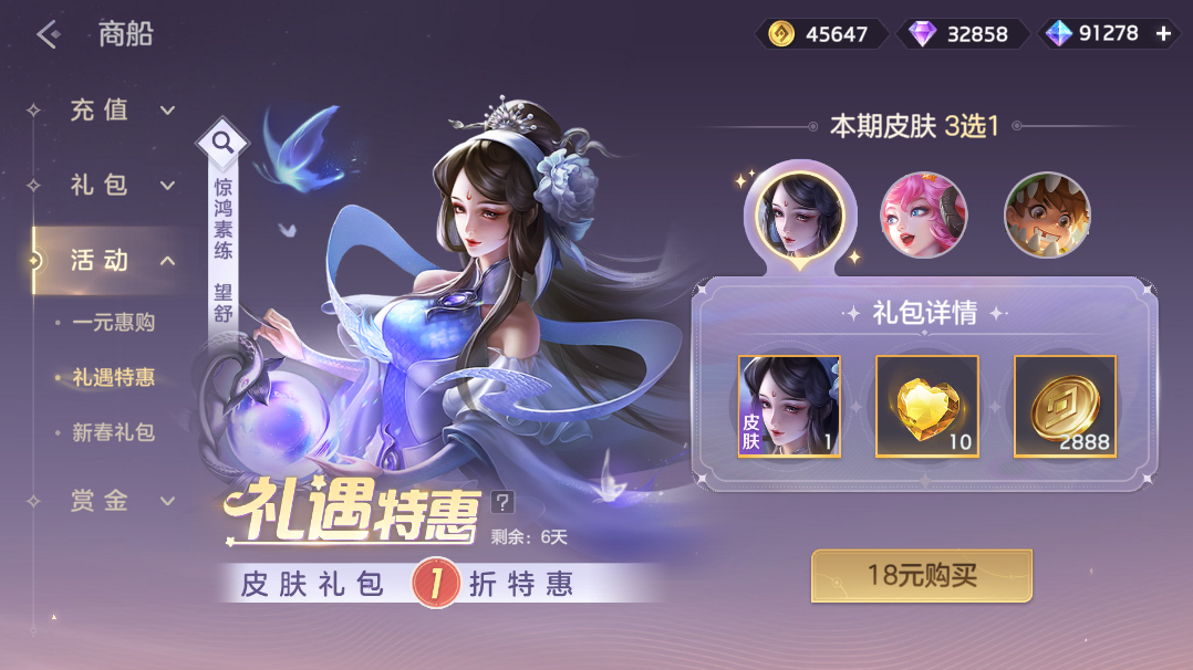 礼遇皮肤礼包限时1折,望舒·惊鸿素练、貂蝉·深眠魔女、鳗鳗·玩具大亨超值3选1获得。