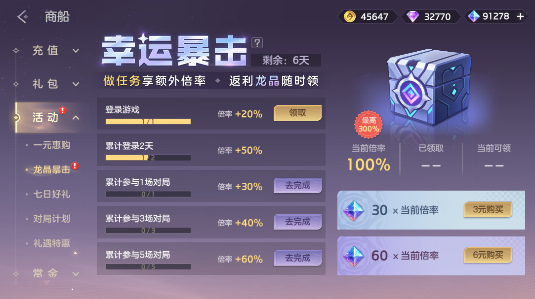 付费3元/6元解锁龙晶暴击,完成任务可相应获得最高价值3倍的90/180龙晶奖励。两个档位可同时充值,奖励数量叠加,最高可领取270龙晶。