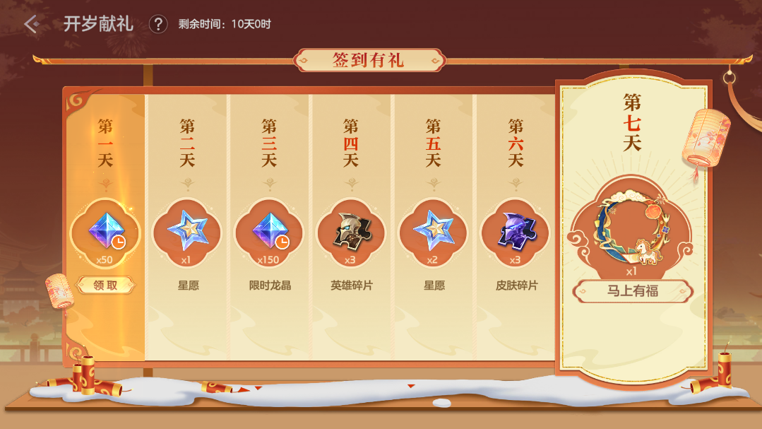 每日放飞天灯领取随机奖励,累计放飞5次解锁自选礼包,皮肤6折龙晶折扣券、10级绘卷经验包、礼券等奖励等。