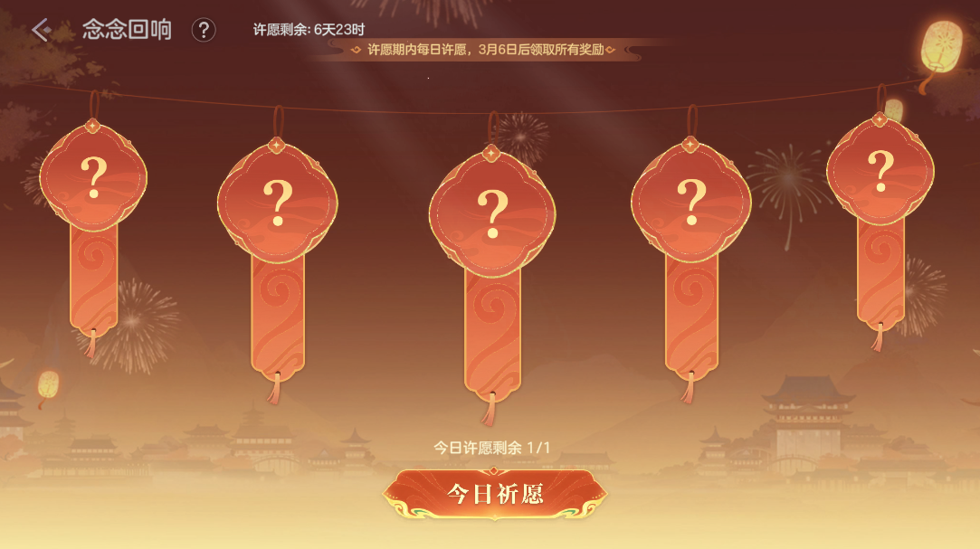 许愿期内,每日登录可许1次愿望,最多可许5个愿望。愿望奖励:3日龙晶月卡、3日皮肤月卡、皮肤8折龙晶折扣券、英雄6折金币折扣券、龙魂祈福卡、皮肤碎片、寻宝签等。