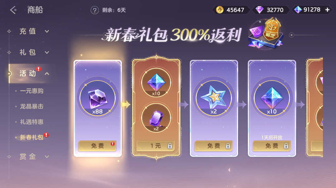 按顺序逐步解锁礼包,传说限定皮肤自选箱、7日组合月卡、龙晶、星愿、礼券、龙魂祈福卡、礼券、寻宝签等多种奖励,累计可享300% 返利。