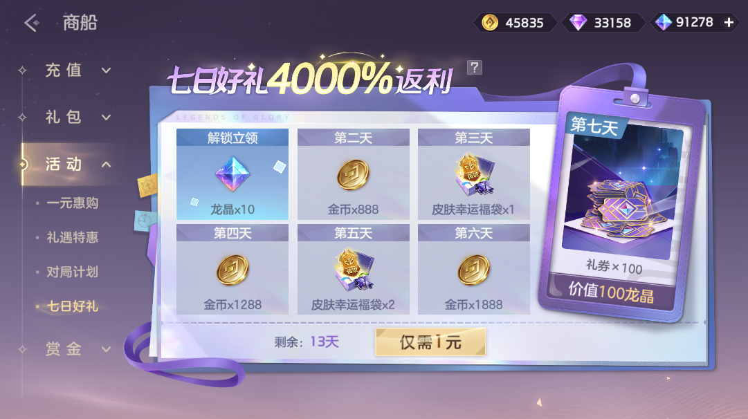 付费1元解锁登录活动,登录游戏即可获得龙晶*10、皮肤幸运福袋(必得皮肤碎片*2、概率额外获得传说皮肤自选箱)、金币奖励,累计登录7天后可得礼券*100。