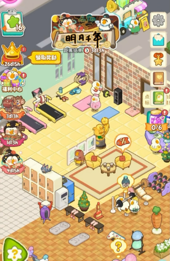肥鹅健身萌态足,合成经营不辛苦,大家需要通过点击棋盘上的元素进行合成,赚取星星来扩建健身房,还能认领各种可爱的肥鹅仔,游戏画风治愈,鹅仔形象Q弹可爱,还有华丽的合成特效和好听的音效,一看就会,体力恢复速度快,不用长时间在线,玩家还能解锁不同主题的健身房,完成订单抽屉的剧情故事,还有各种限定活动。