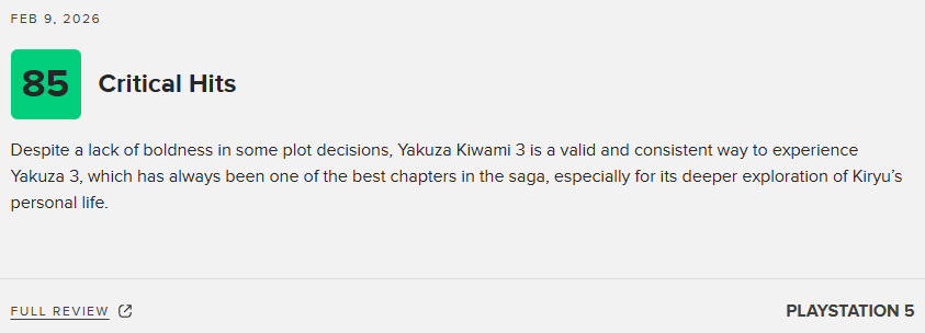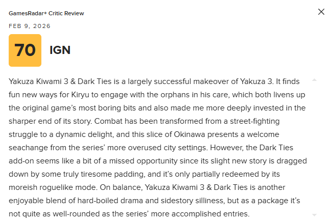 《如龙极3/如龙3外传 Dark Ties》将于2月6日正式发售。近日,本作的媒体评分也已解禁。截至目前,《如龙极3/如龙3外传 Dark Ties》M站媒体均分为75分,共收录40家媒体。其中,IGN给出了7分的评价。