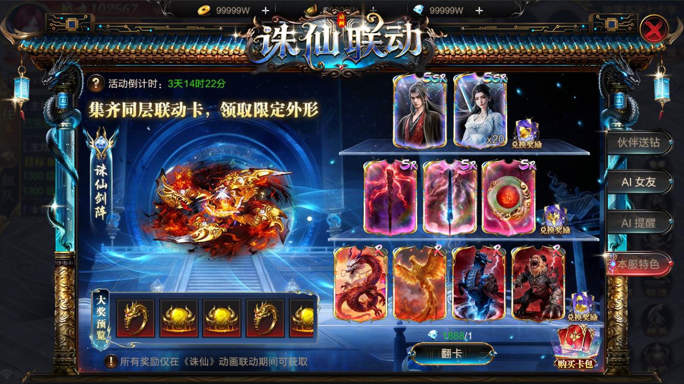 活动期间,收集指定卡牌,即可兑换精美时装、稀有法宝、灵兽坐骑与宠物,更有全新养成"飞轮部件"可得。集齐一套,成就与实力同时到手!