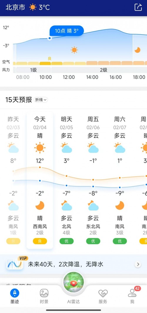 春运首周我国天气呈现先暖后寒、雨雪增多的特征,2月5日前后强冷空气自北向南推进,北方多地气温骤降10℃左右并伴随大风,南方则迎来大范围阴雨,部分地区出现雨雪转换,道路湿滑、能见度降低等问题突出。针对春运复杂的天气形势,墨迹天气预报APP会员可享受专属的精细化预报服务,依托平台AI驱动的预报系统,获取公里级、每6分钟更新的降水预报,以及未来48小时逐小时降水追踪的定点速报。同时,会员可查看40天超长期天气趋势预报,精准掌握出发地与目的地的气温变化、雨雪起止时间,提前预判道路结冰、团雾等春运出行高风险气象状况。