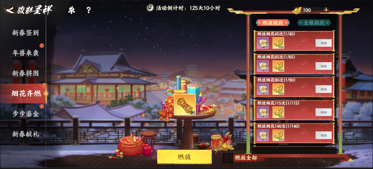 全服共庆:全服玩家共同累计燃放次数,达到指定目标即可解锁全服进度大奖!