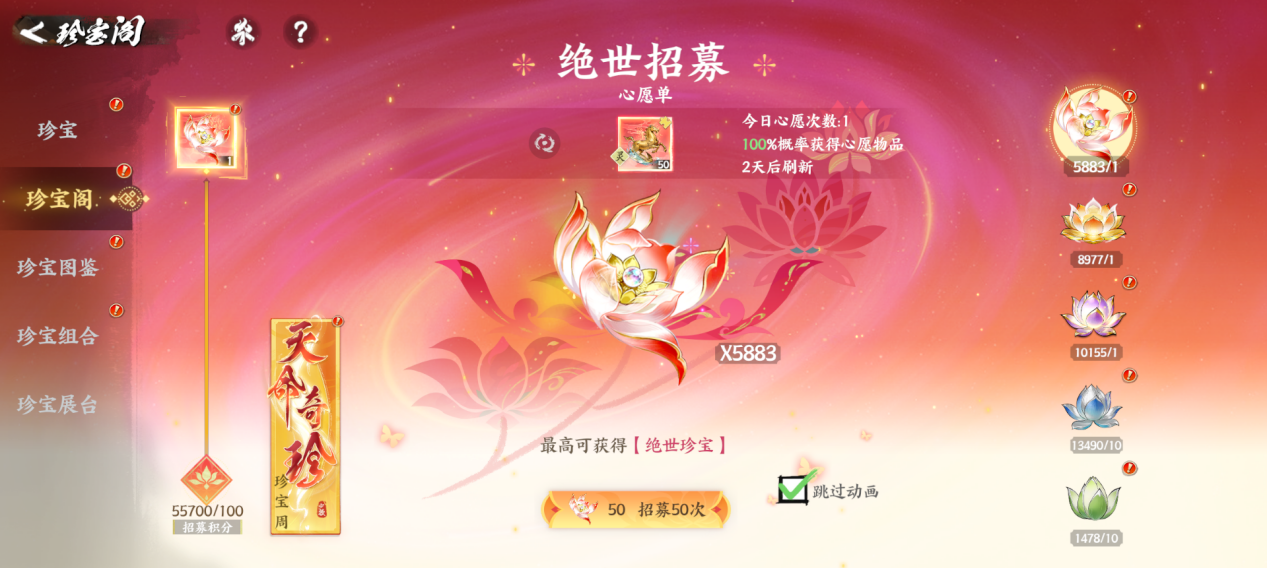 选定1个心愿珍宝,抽取命中率提升至100%! 指哪打哪,绝不歪卡!
